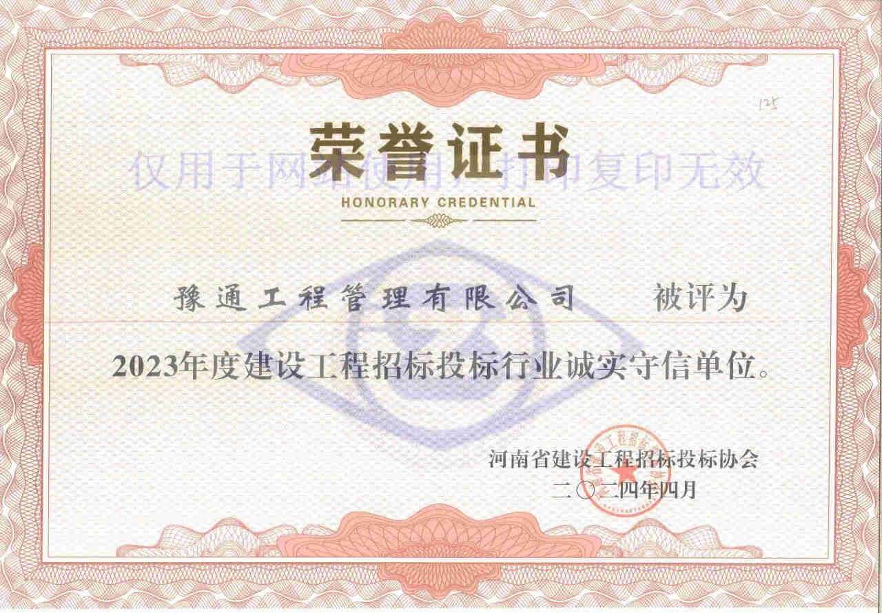 近日,河南省建設(shè)工程招標(biāo)投標(biāo)協(xié)會發(fā)布了《關(guān)于公布2023年度建設(shè)工程招標(biāo)投標(biāo)行業(yè)誠實守信單位的通知》(豫建招協(xié)字〔2024〕11號),我公司榮獲“2023年度建設(shè)工程招標(biāo)投標(biāo)行業(yè)誠實守信單位”榮譽稱號。