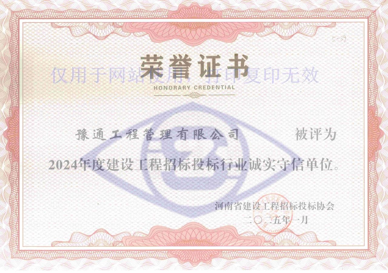 近日,河南省建設(shè)工程招標投標協(xié)會發(fā)布《關(guān)于公布2024年度建設(shè)工程招標投標行業(yè)誠實守信單位的通知》,我公司憑借良好的信譽,成功獲評“2024年度建設(shè)工程招標投標行業(yè)誠實守信單位”榮譽稱號。